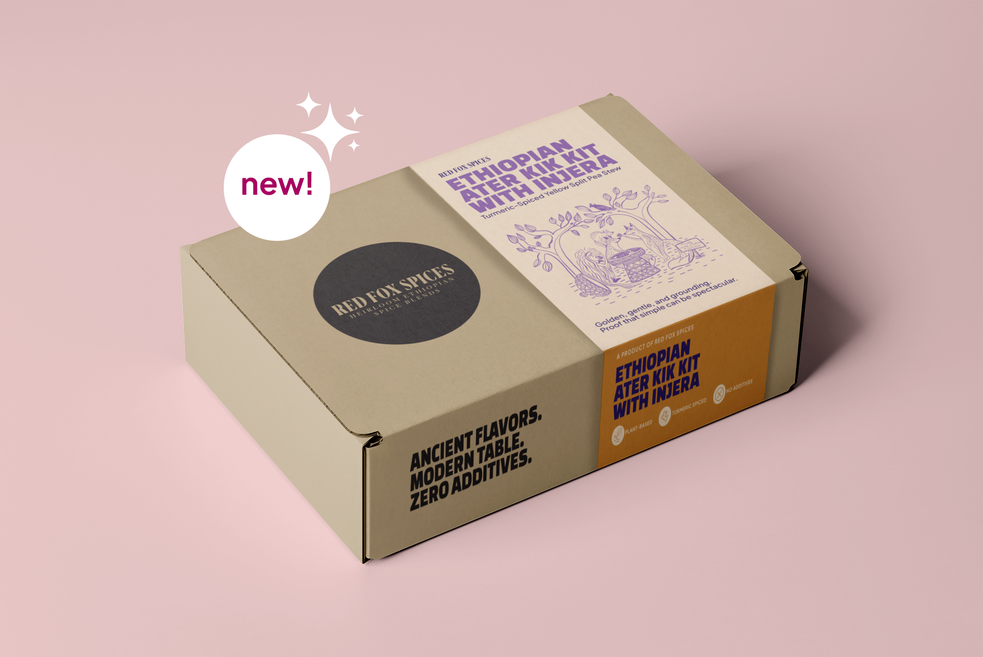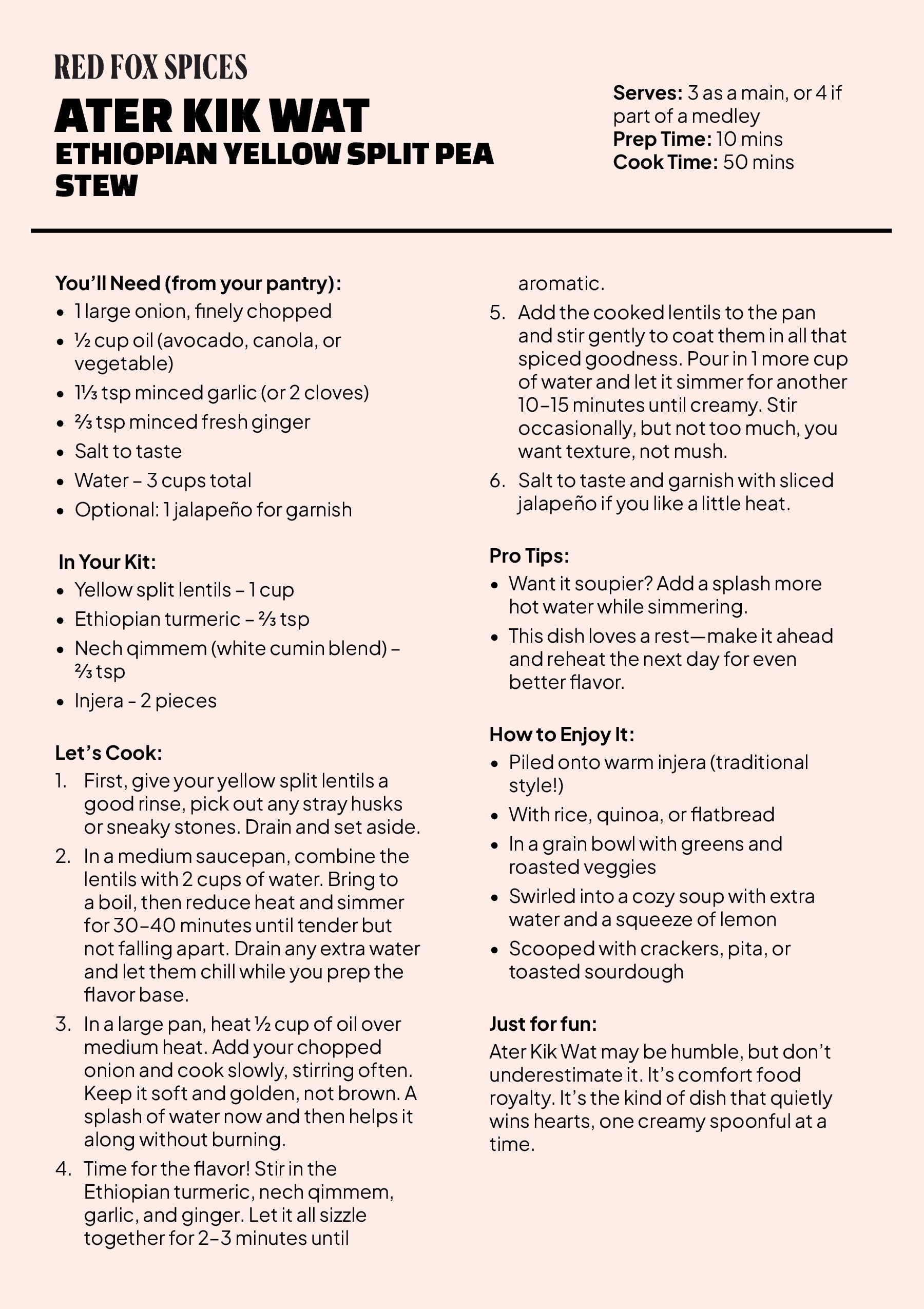 Your kit comes with everything you need, including, 100% teff injera baked in Ethiopia. Just add onions, garlic, oil, and water. No stress, no fancy tools. Just one pot and a little time.