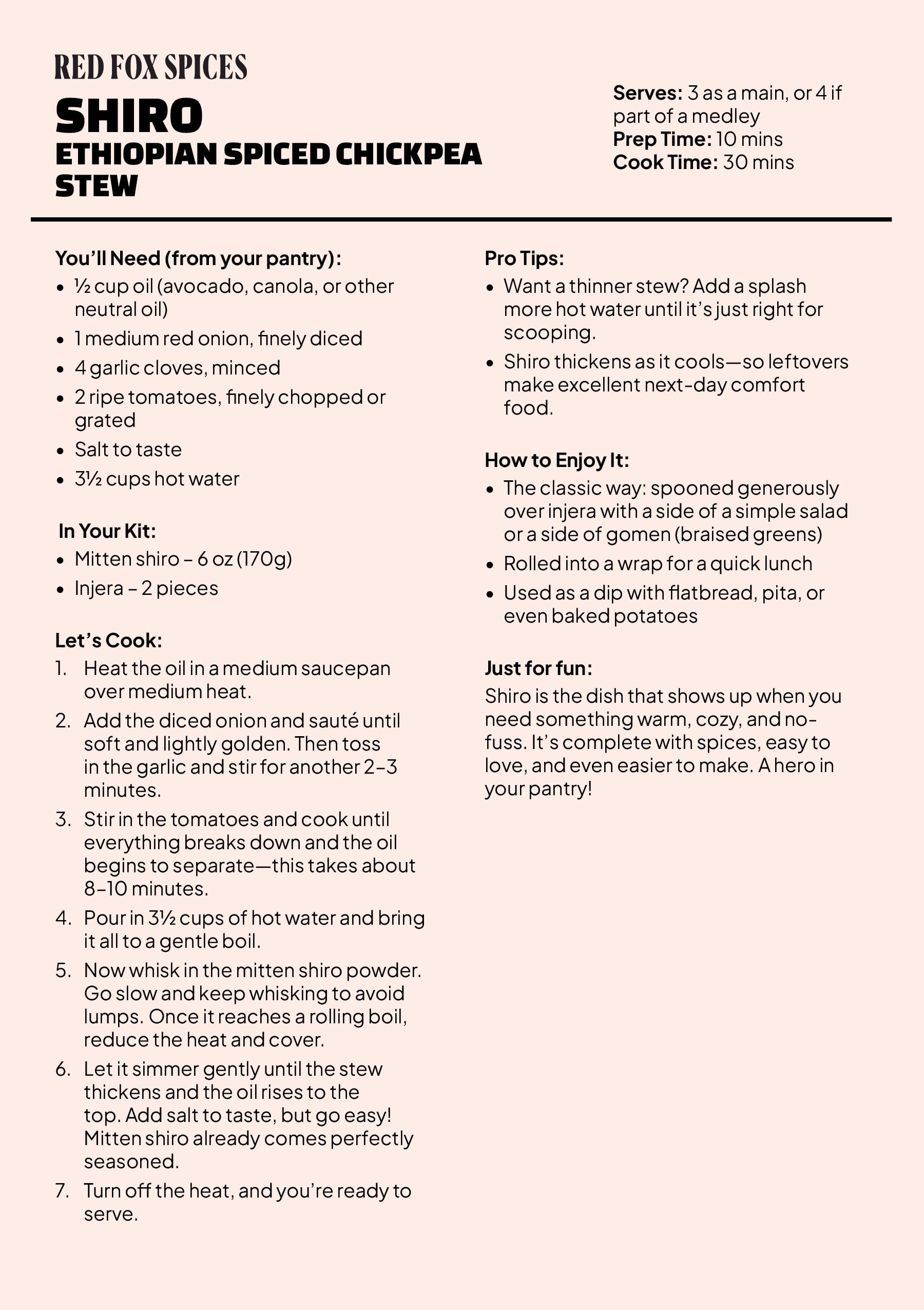 Your kit includes everything you need, including, 100% teff injera baked in Ethiopia. All you do is add water, garlic, tomatoes (optional) and a little oil. That’s it. Stir, simmer, and serve in under 30 minutes.